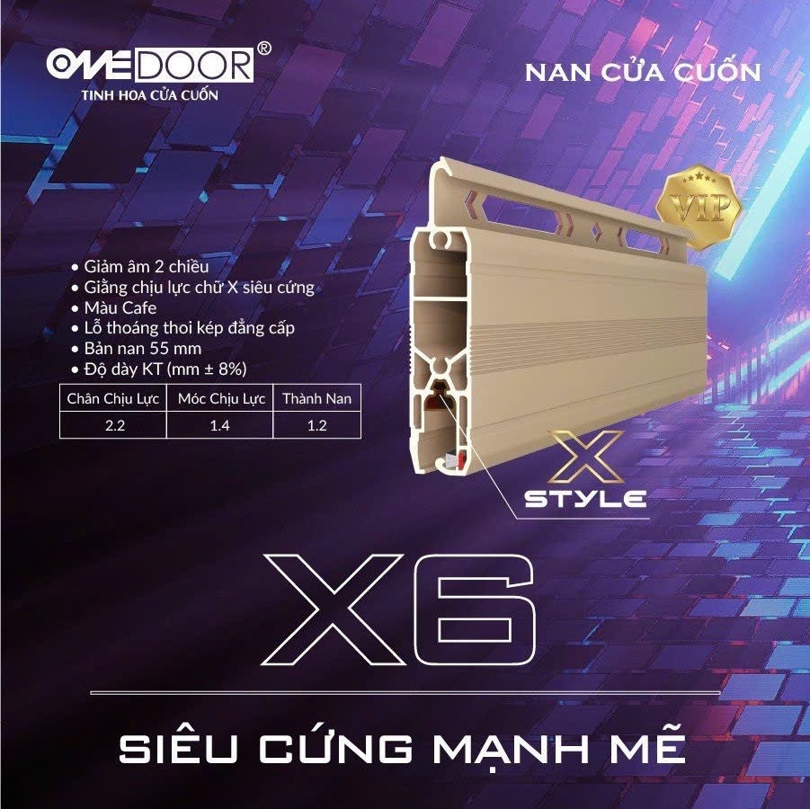 CỬA CUỐN SIÊU CỨNG ONEDOOR X6là một cuộc cách mạng về mặt thiết kế. Bản nan cửa cuốn Onedoor X6 với thiết kế cấu trúc chịu lực – X styletăng cứng và bốn chân chịu lực đảm bảo khả năng chịu lực lớn nhất với cùng một lượng nhôm, giúp bản nan đảm bảo sự vững vàng, cứng cáp như các mẫu nan chống bão, cửa công nghiệp thông thường, nhưng lại không mất đi sự nhẹ nhàng êm ái khi vận hành giúp nâng cao độ bền và tính thẩm mĩ.